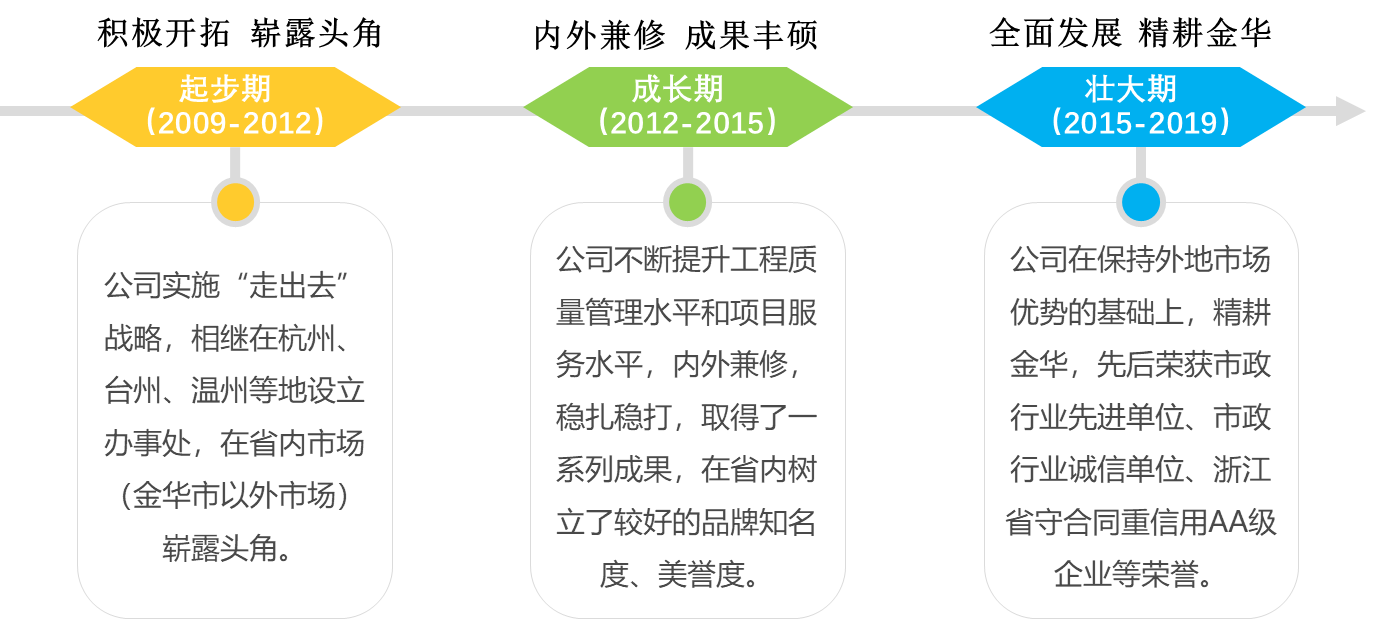 公司面對(duì)行業(yè)變化,調(diào)整經(jīng)營(yíng)策略,在保持外地市場(chǎng)優(yōu)勢(shì)的基礎(chǔ)上,精耕金華市場(chǎng),注重全面發(fā)展。公司先后榮獲浙江省先進(jìn)建筑業(yè)企業(yè)、金華市建筑業(yè)骨干企業(yè)、 金華市先進(jìn)建筑業(yè)企業(yè)、金華市建筑業(yè)誠(chéng)信企業(yè)、市政行業(yè)先進(jìn)單位、市政行業(yè)誠(chéng)信單位、浙江省守合同重信用AA級(jí)企業(yè)等榮譽(yù)。主要大事跡有: